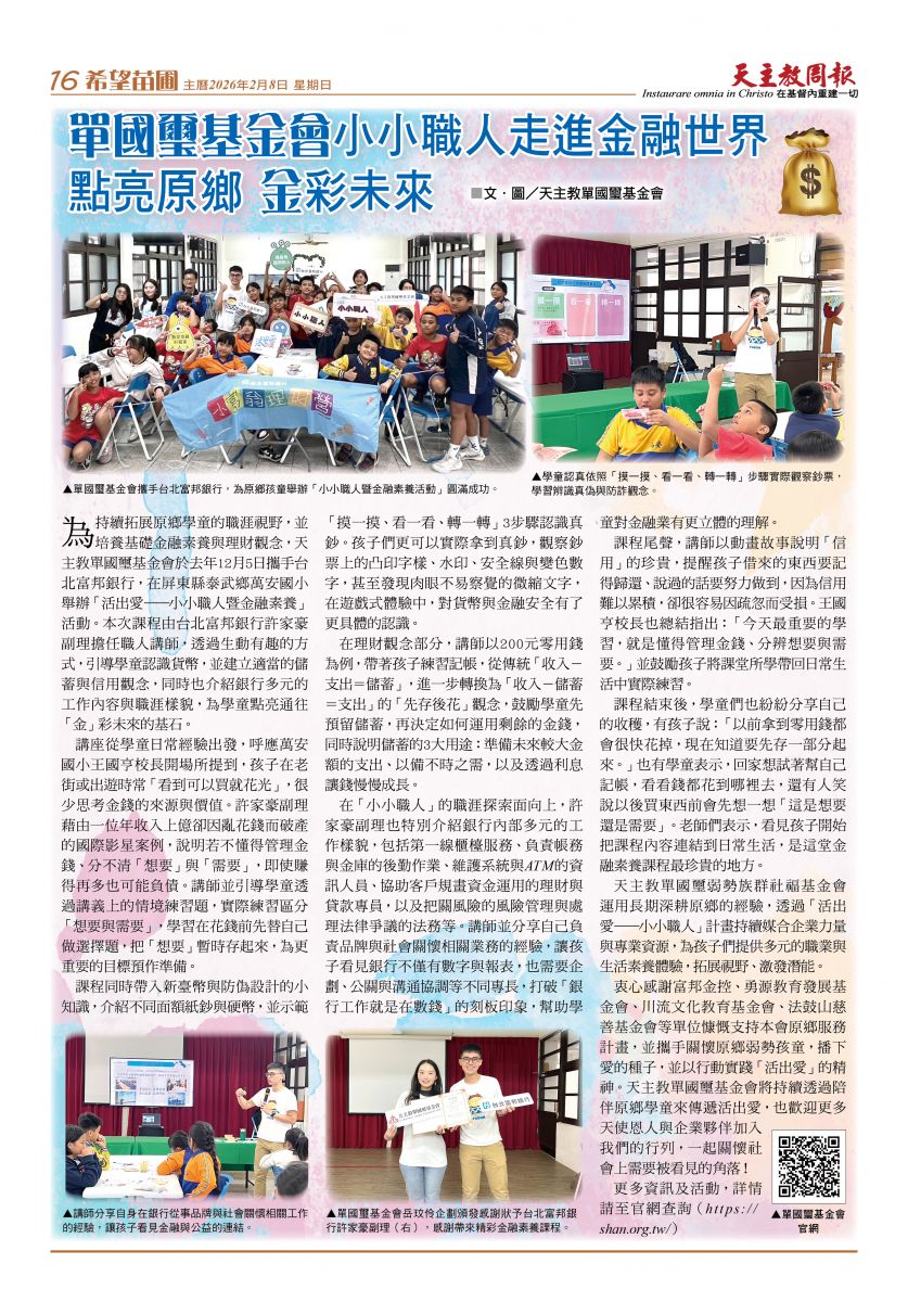 為持續拓展原鄉學童的職涯視野,並培養基礎金融素養與理財觀念,天主教單國璽基金會於 114 年 12 月 5 日攜手台北富邦銀行,在屏東縣泰武鄉萬安國小辦理「活出愛-小小職人暨金融素養」活動。本次課程由台北富邦銀行許家豪副理擔任職人講師,透過生動有趣的方式,引導學童認識貨幣,並建立適當的儲蓄與信用觀念,同時也介紹銀行多元的工作內容與職涯樣貌,為學童點亮通往「金」彩未來的基石。